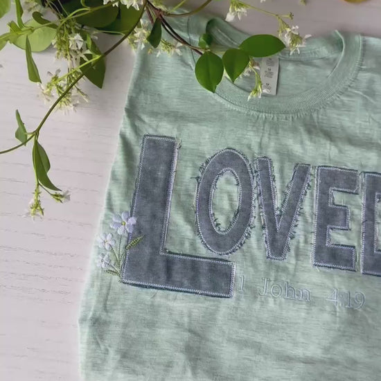 ME ENCANTÓ — Camiseta de mezclilla con apliques Heather Mint. Inspirado en Juan 4:19