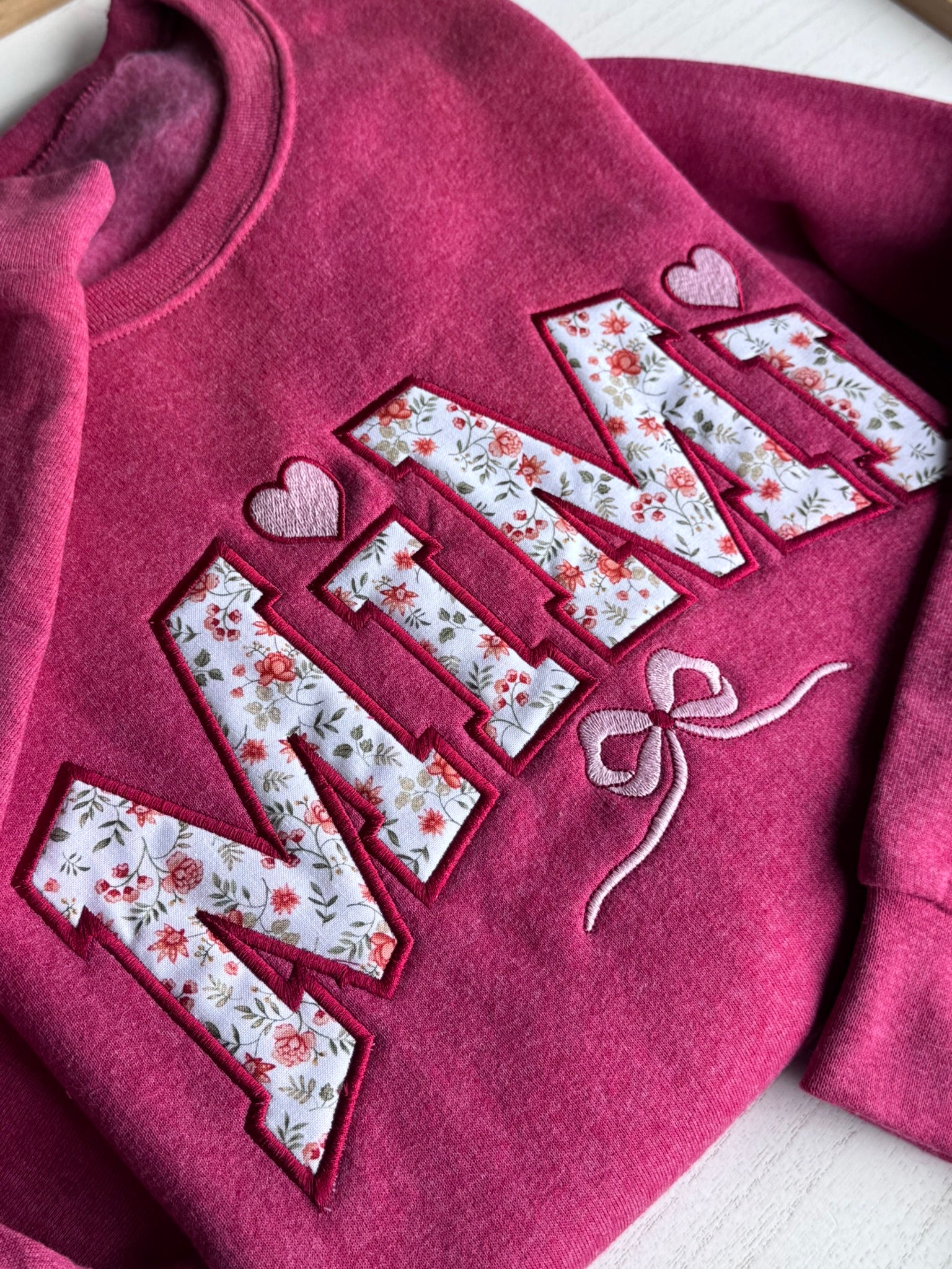 Esta cómoda sudadera de cuello redondo de calidad boutique presenta un impresionante diseño MiMi de apliques de tela floral con delicados detalles de corazón y un dulce lazo bordado, todo hecho a mano con bordado premium en nuestro estudio de Texas. NO impreso, NO vinilo. Bordado real hecho con amor. 🙏