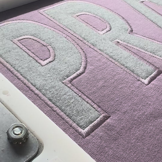 La palabra PRAY está creada con un delicado bordado de apliques, con una tela texturizada gris jaspeado, un sutil detalle de cruz y acentos de corazón que forman la letra Y, NO impreso, NO vinilo. Bordado real hecho a mano con amor en nuestro estudio de Texas. 🙏
