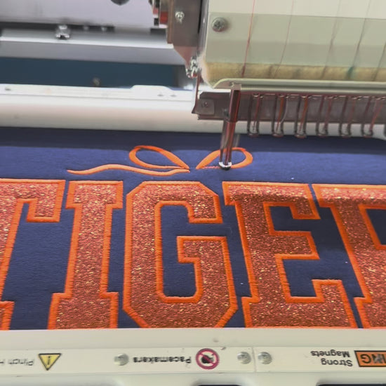 - 🐯 NO es vinilo — bordado de purpurina de primera calidad con letras ricas estilo varsity