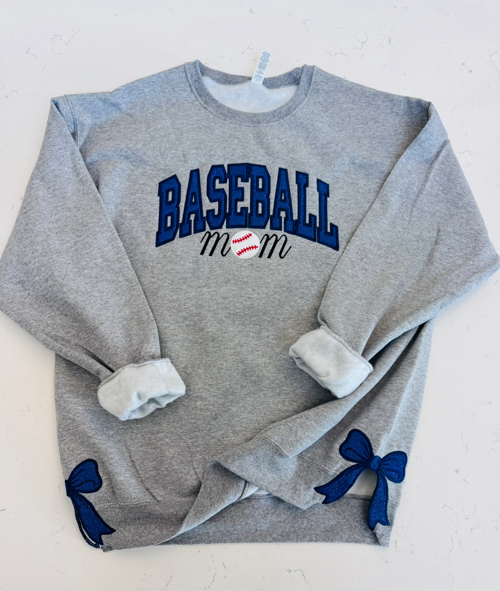 This Baseball Mom sweatshirt features a bold collegiate-style design made with sparkle applique lettering, detailed embroidery, and a classic baseball appliqué for a clean yet eye-catching look.