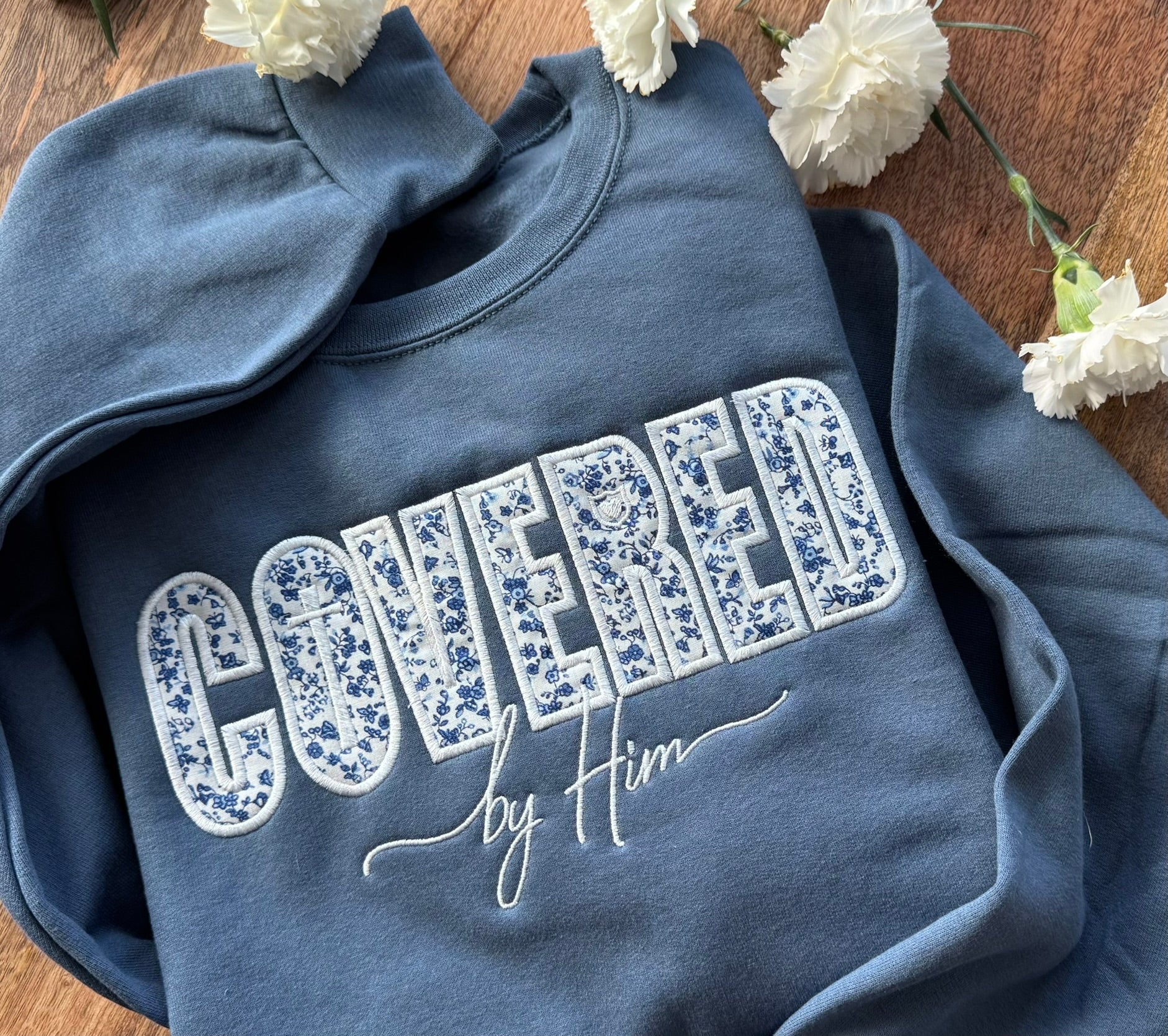 This beautiful piece of clothing features the phrase “Covered by Him” embroidered with delicate blue floral appliqué, symbolizing faith, protection, grace, and God’s covering over your life.