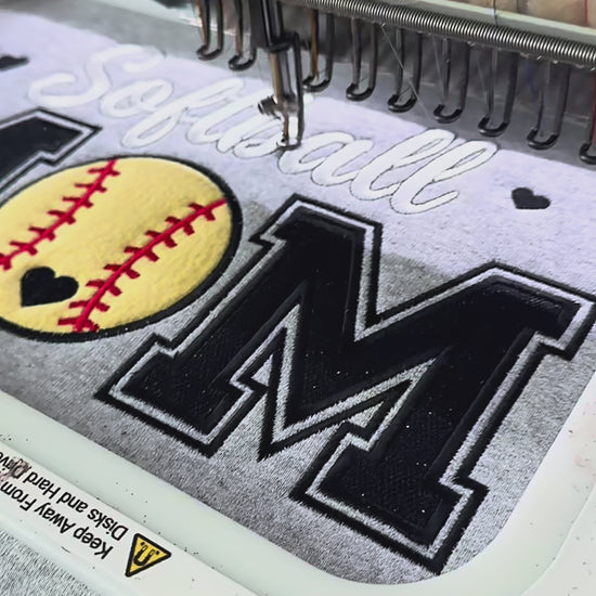 Designed with a bold varsity-inspired "MOM" layout, this piece features a textured yellow softball appliqué, detailed red stitching, delicate heart accents, and elegant "Softball" script embroidery — eye-catching on the field and beyond.