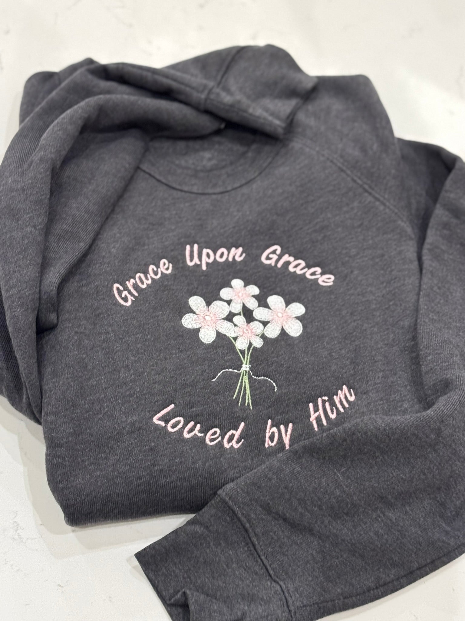 Grace Upon Grace Embroidered Christian Sweatshirt – Loved by him, Faith Crewneck