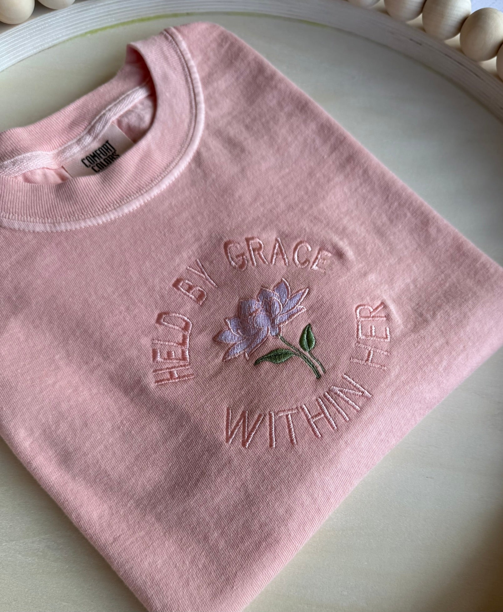 Held by Grace Embroidered Tee, Christian Shirt for Women, Minimal Faith Shirt, Comfort Colors T-Shirt, Modern Faith Apparel